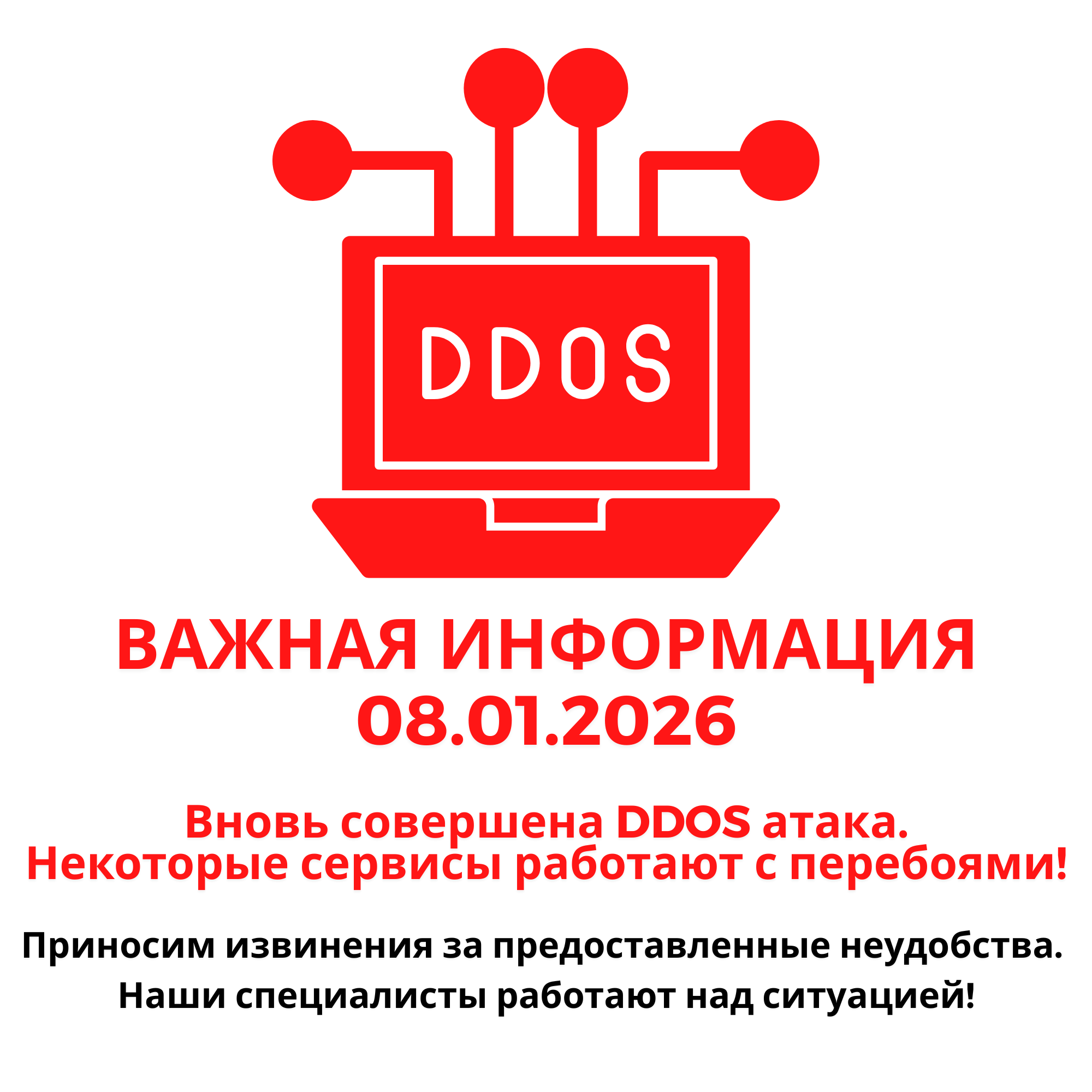 Уведомляем, что 08.01.2026 в 00:55 по иркутскому времени на сеть была зафиксирована повторная атака. В связи с этим в отдельных районах могут наблюдаться временные перебои в работе интернет-доступа.