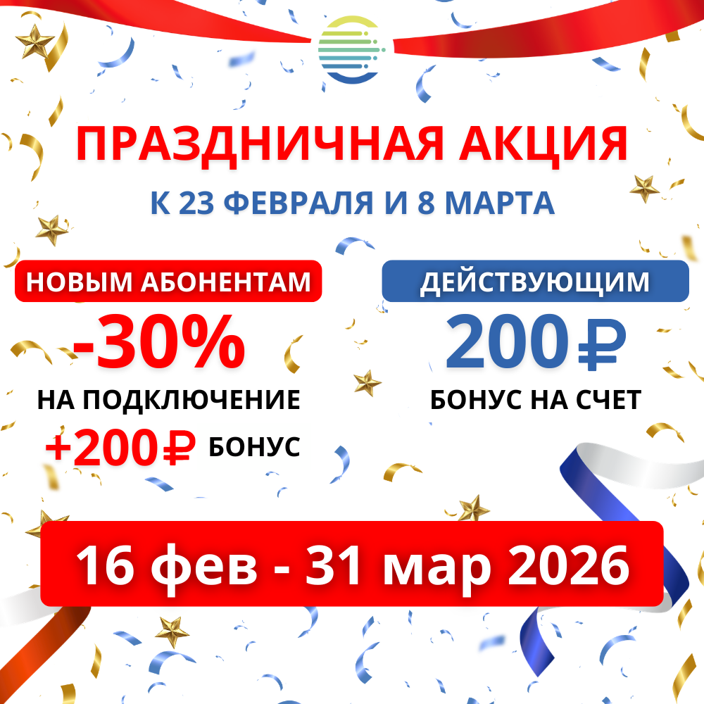 Новым абонентам: Скидка 30% на стоимость подключения и бонус 200 рублей на лицевой счёт.